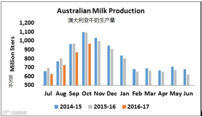 在澳大利亚,10月份的牛奶产量为9.68亿升,比去年同期暴跌11.4%。这至少是21世纪以来第一次出现10月份的牛奶产量未能达到10亿升的情况。这使得本季度至今的产量出现10.4%的年度赤字。每日乳业报告指出,“相比2015年同期,澳大利亚在本季度的四个月中有三个月出现了两位数的下跌,这是自2006-2007年度以来第一次出现如此跌幅情况。”
