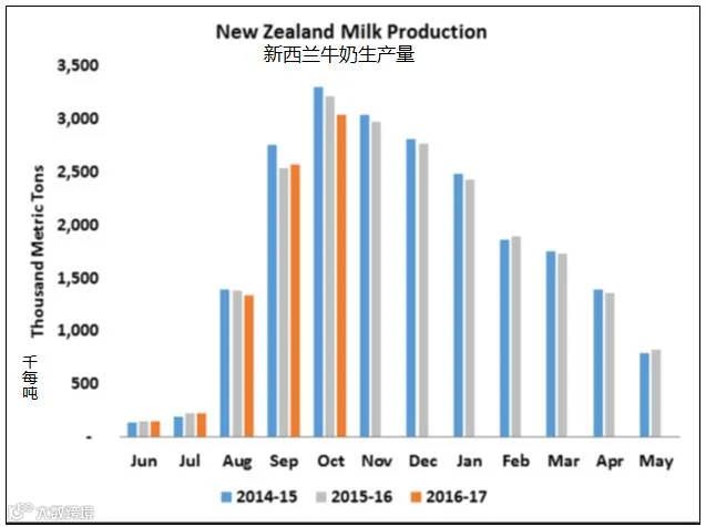 但前景是更光明的。这主要是由于美国海外牛奶产量大幅放缓。大洋洲10月份的牛奶产量已经达到了高峰,今年的总产量差强人意。新西兰公布了5.5%的年度产量赤字,固体乳产量下降了6.1%。这导致本季度至今的牛奶收集量比2015 – 2016年度的前五个月下降2.4%(以液体乳计算)。而固体乳产量比上季度下降2.9%。