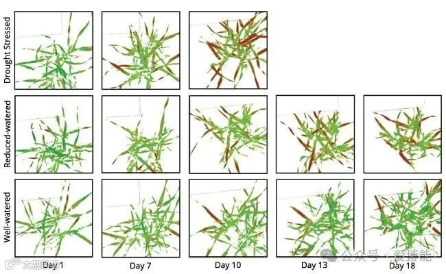 大麦在干旱胁迫下的时空动态,可以通过假彩色图像进行可视化。干旱胁迫植物的图像只记录到第10天,也就是仅在肉眼可见的干旱胁迫出现之前,进行对植物状态的观察。图像中,绿色区域表示植物健康的概率较高,而深红色区域则表示与干旱胁迫相关的概率较高。