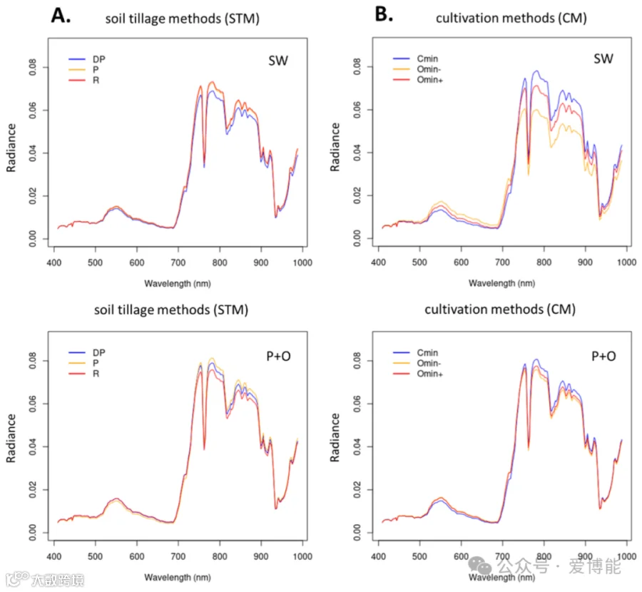 平均辐射度,来自春小麦(SW)、豌豆和燕麦混合物(P+O)的高光谱数据,按照A.土壤耕作法(STM)和B.耕作法(CM)农业作分组,其中包含子集。