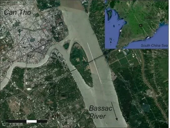 图 2:湄公河三角洲地图及研究区域:白线表示巴萨河 (Bassac River) 的河道,该河是芹苴市附近湄公河的支流,在此运用 GasScouter 分析仪来监测二氧化碳和甲烷释气(相关数据见图 3)。浮筒室在向下漂游时,会监测外向通量、水流动力学和河床深度。