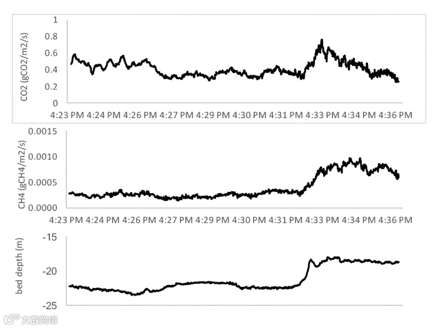 图 3:从湄公河三角洲排出的二氧化碳和甲烷释气(河道见图 2)。二氧化碳和甲烷外向通量朝向该河段末端的增加量与河床深度的减小量相关。随着河流变浅,河流浑水层不断增厚,将深层河水携带到地表,继而产生更多的释气。