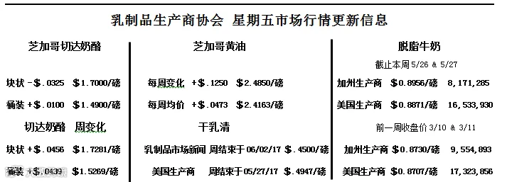 关注本土消息,美国农业部宣布5月份的三级奶价格为15.57美元/100磅,从4月份的最低价上涨35美分,与去年同期相比上涨2.81美元。5月份的四级奶价格为14.49美元/100磅,比4月份价格高出48美分,比去年同期上涨1.40美元。加州4a牛奶的价格在5月攀升至14.43美元/100磅,涨幅70美分,而4b牛奶价格则为15.25美元/100磅,比上月涨95美分。在过去的两周里,三级奶期货价格上涨约一美分,而近期的四级奶期货合约则上涨50美分以上。