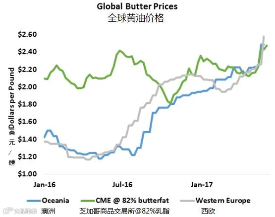 几乎所有产品需求增加——尤其是乳脂——因此全球乳制品价格攀升。恒天然集团宣布2016-2017年度销售给价格新西兰乳制品生产商的农场牛奶价格上涨15美分。包括股息在内,目前的预估支出为6.55新西兰元/千克乳固形物,远高于本季度初的4.60新西兰元/千克预估值。恒天然集团根据本季基准价,把其对2017-2018年度牛奶价格的初步预估值从派息前的6.50新西兰元/千克乳固形物上调5.7%,再破2013-2014年度高价。