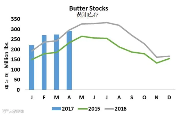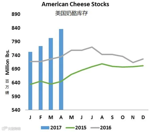相反,奶酪市场供应充足。4月份的美国奶酪库存量达3270万磅,上涨4.1%。3月到4月的库存增幅是1999年以来最大的。美国奶酪库存的增幅带动奶酪总库存的增长量高达4200万磅,总库存量达13.3亿磅,创历史新高。奶酪总库存量相比去年涨幅10.4%。