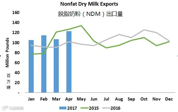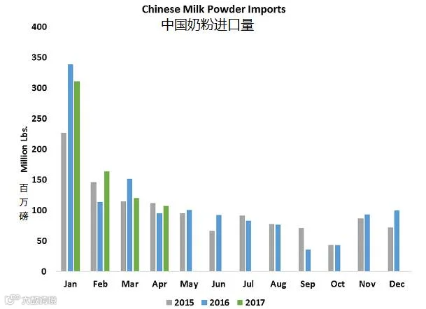 中国对乳制品的进口需求日渐加强。4月的中国奶粉进口量略高于去年同期。今年至今,中国脱脂奶粉进口量比2016年前4个月的高出近9%,而全脂奶粉的进口量则比去年同期下跌1.4%。据每日乳业报道,中国婴幼儿配方奶粉的进口量有望破去年的最高纪录。相比去年同期,今年至今的中国奶酪进口量涨幅20%,乳清进口量涨幅24%。