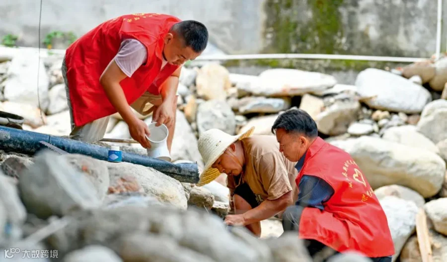 在贵州省从江县刚边壮族乡银平村,党员志愿者帮助受灾村民修整水管(2022年7月1日摄) 杨文斌摄