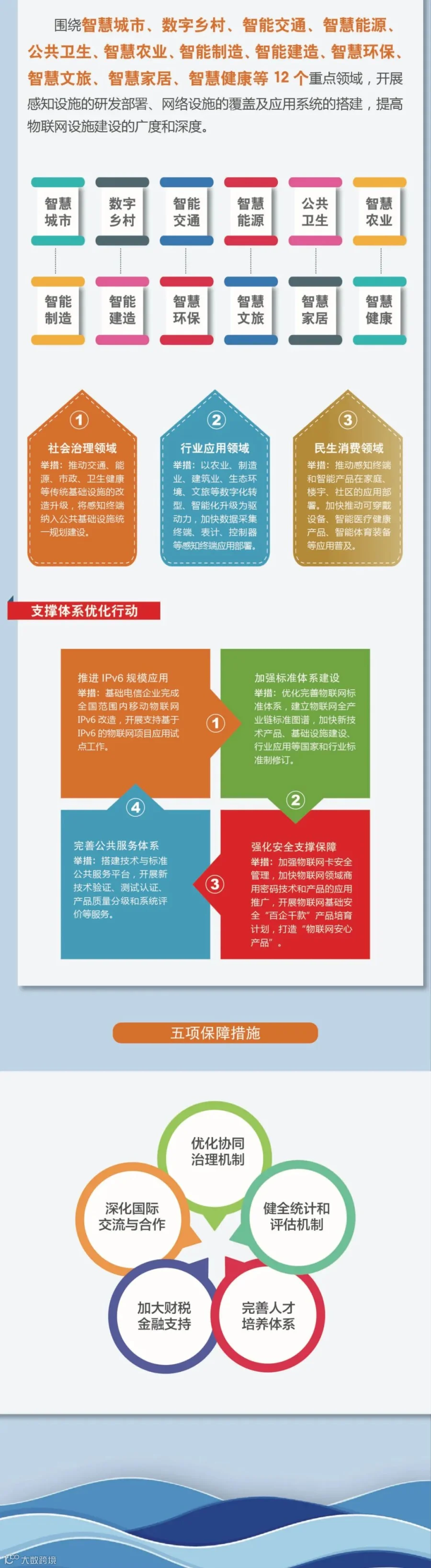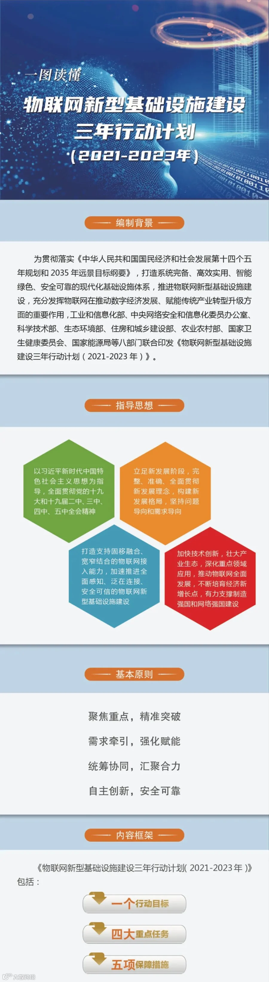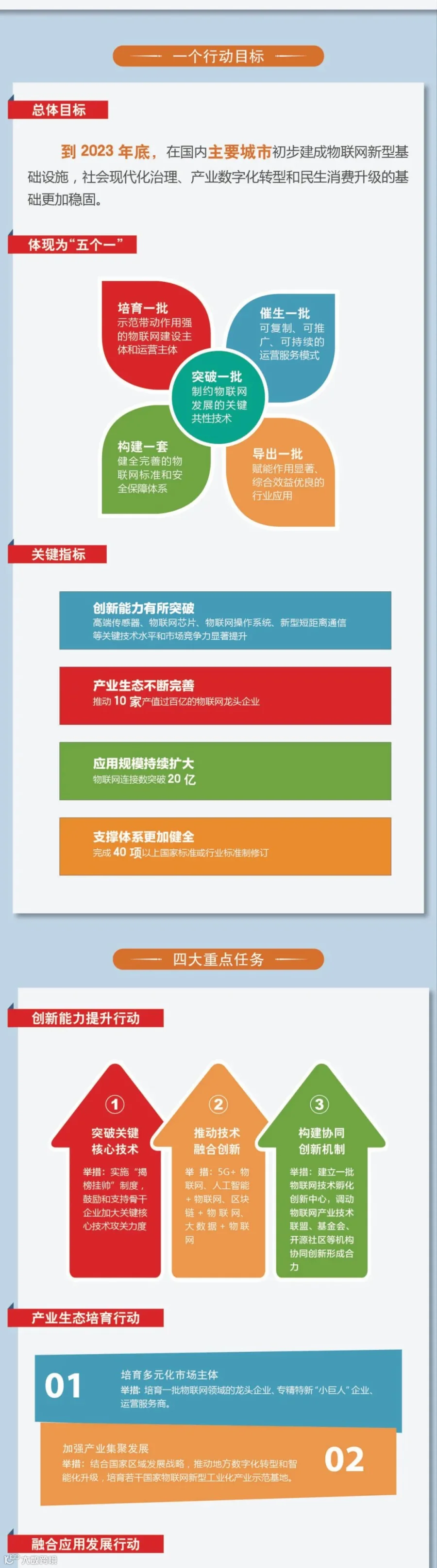 《行动计划》坚持问题导向和需求导向,以支撑制造强国和网络强国建设为目标,打造支持固移融合、宽窄结合的物联网接入能力,加速推进全面感知、泛在连接、安全可信的物联网新型基础设施。《行动计划》提出了四大行动12项重点任务。一是开展创新能力提升行动,聚焦突破关键核心技术,推动技术融合创新,构建协同创新机制。二是开展产业生态培育行动,聚焦培育多元化主体,加强产业聚集发展。三是开展融合应用创新行动,聚焦社会治理、行业应用和民生消费三大应用领域,持续丰富多场景应用。四是开展支撑体系优化行动,聚焦完善网络部署、标准体系、公共服务、安全保障,完善发展环境。同时,《行动计划》以专栏形式列出了各项任务落实的具体指引。为保障四大行动落地实施,《行动计划》明确了优化协同治理机制、健全统计和评估机制、完善人才培养体系、加大财税金融支持、深化国际交流与合作等五个方面的保障措施。