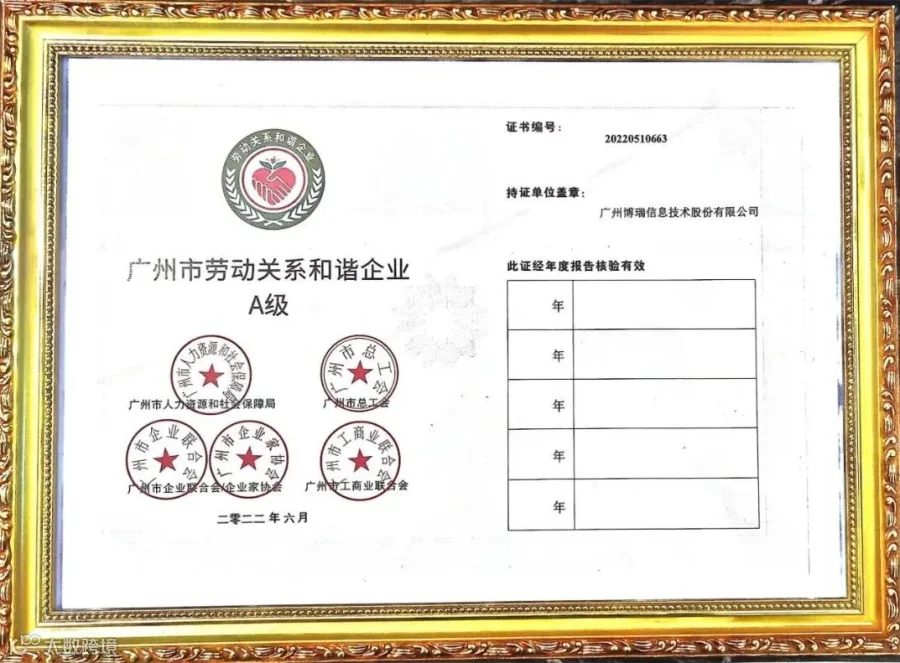▲广州市劳动关系和谐企业证书