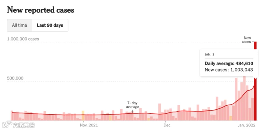 美国日增确诊甚至超过了疫情爆发时的顶点,1月3日单日新增确诊病例超百万例,创全球新纪录。