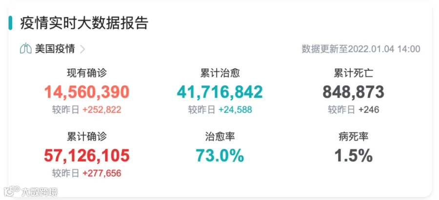 截止到2022年1月4日14:00时 ,美国新冠肺炎累计确诊病例达到57126105例,累计死亡病例达到848873例。
