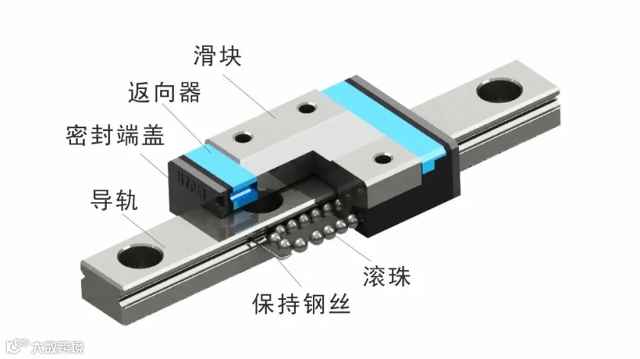 带有防止钢球脱落的保持钢丝,即使滑块从导轨上取下,钢球也不会脱落。