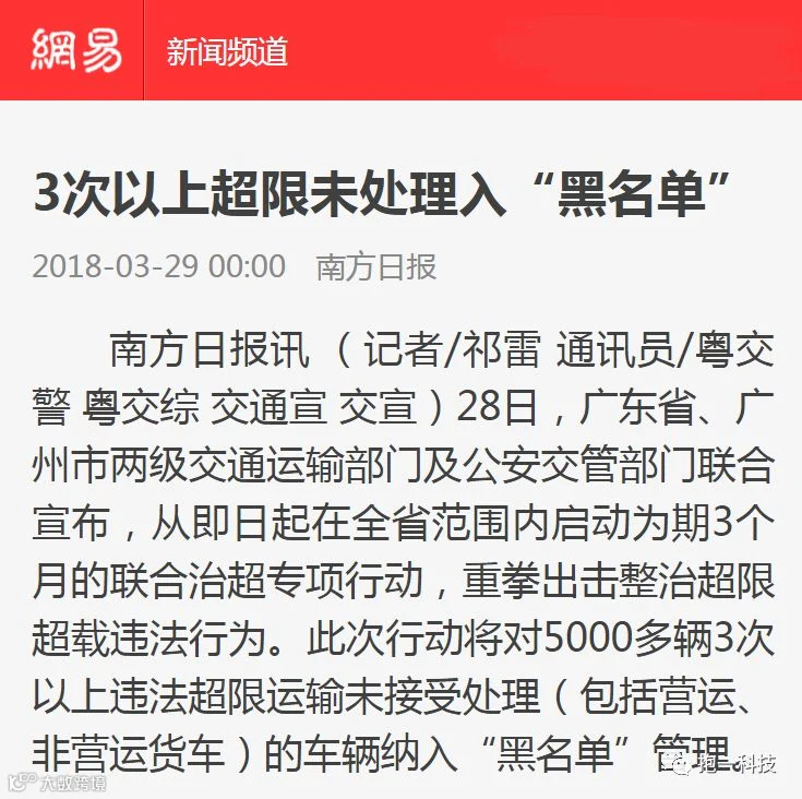 南方日报讯 (记者/祁雷 通讯员/粤交警 粤交综 交通宣 交宣)28日,广东省、广州市两级交通运输部门及公安交管部门联合宣布,从即日起在全省范围内启动为期3个月的联合治超专项行动,重拳出击整治超限超载违法行为。此次行动将对5000多辆3次以上违法超限运输未接受处理(包括营运、非营运货车)的车辆纳入“黑名单”管理。