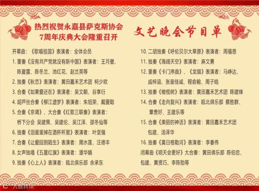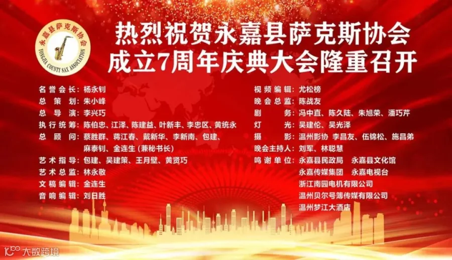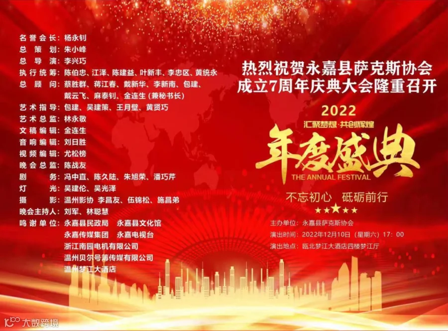 绚丽的灯光,优美的旋律,2022.12.10晚上,由永嘉县萨克斯协会主办的“永嘉萨克斯协会2022年度全体会员代表大会暨协会成立7周年文艺晚会”在温州梦江大酒店举行。