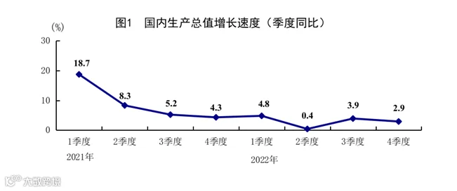 初步核算,2022年全年国内生产总值 1210207亿元,按不变价格计算,比上年增长3.0%。分产业看,第一产业增加值88345亿元,比上年增长4.1%;第二产业增加值483164亿元,增长3.8%;第三产业增加值638698亿元,增长2.3%。分季度看,一季度国内生产总值同比增长4.8%,二季度增长0.4%,三季度增长3.9%,四季度增长2.9%。从环比看,四季度国内生产总值与三季度持平。