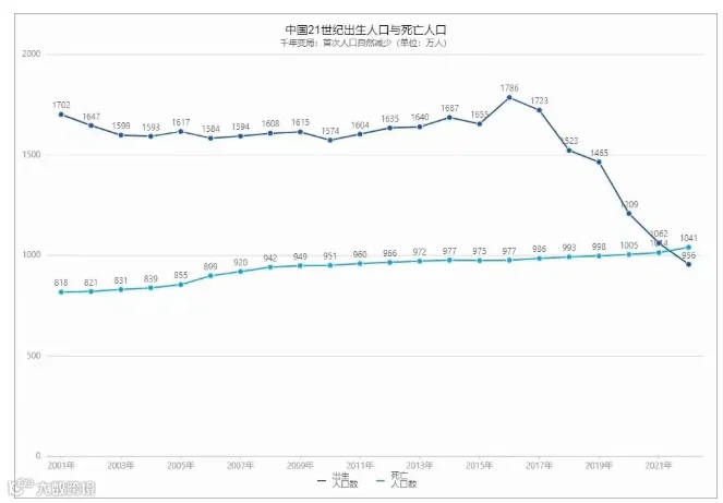 2022年,中国人口出现近61年来首次负增长。2022年年末全国人口(包括31个省、自治区、直辖市和现役军人的人口,不包括居住在31个省、自治区、直辖市的港澳台居民和外籍人员)141175万人,比上年末减少85万人。全年出生人口956万人,人口出生率为6.77‰;死亡人口1041万人,人口死亡率为7.37‰;人口自然增长率为-0.60‰。