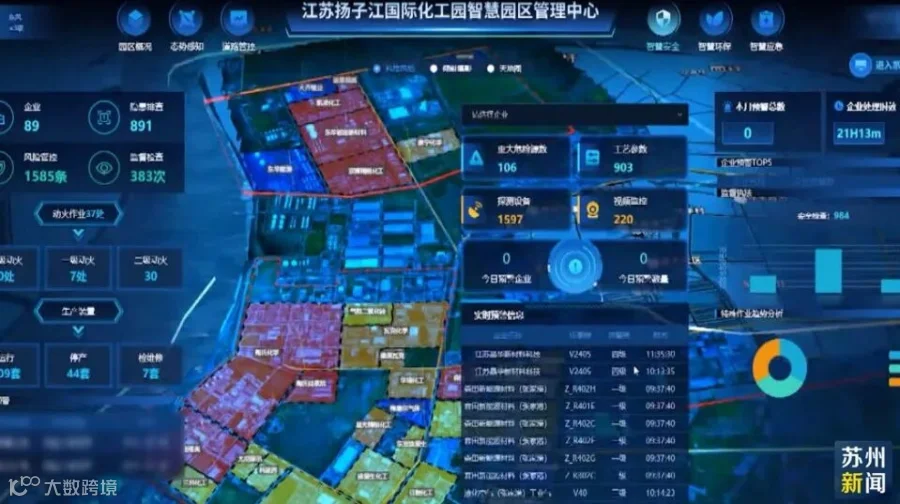 走进江苏扬子江国际化学工业园智慧园区管理中心可以看到,借助大屏电子地图,园区内的化工生产企业均按照风险等级予以划分。每家企业危险废物产出情况、关键生产数据等都实时在图上显示,从而全面提高园区内一般工业固体废物全流程监管追溯能力。