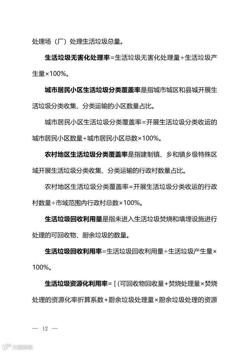 生活垃圾资源化利用率= [(可回收物回收量+焚烧处理量×焚烧处理的资源化率折算系数+厨余垃圾处理量×厨余垃圾处理的资源化率折算系数+卫生填埋处理量×卫生填埋处理的资源化率折算系数)/(可回收物回收量+生活垃圾清运量)] ×100%。