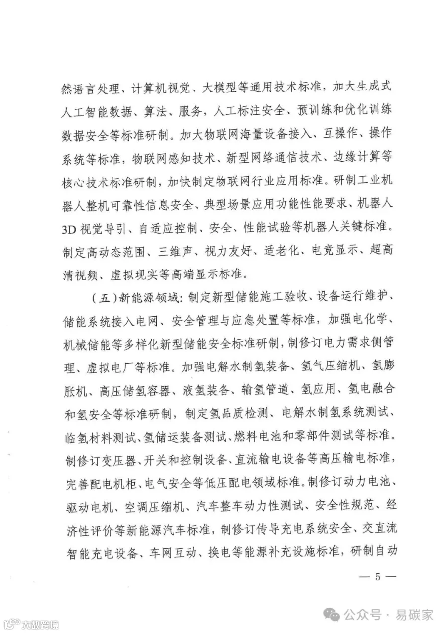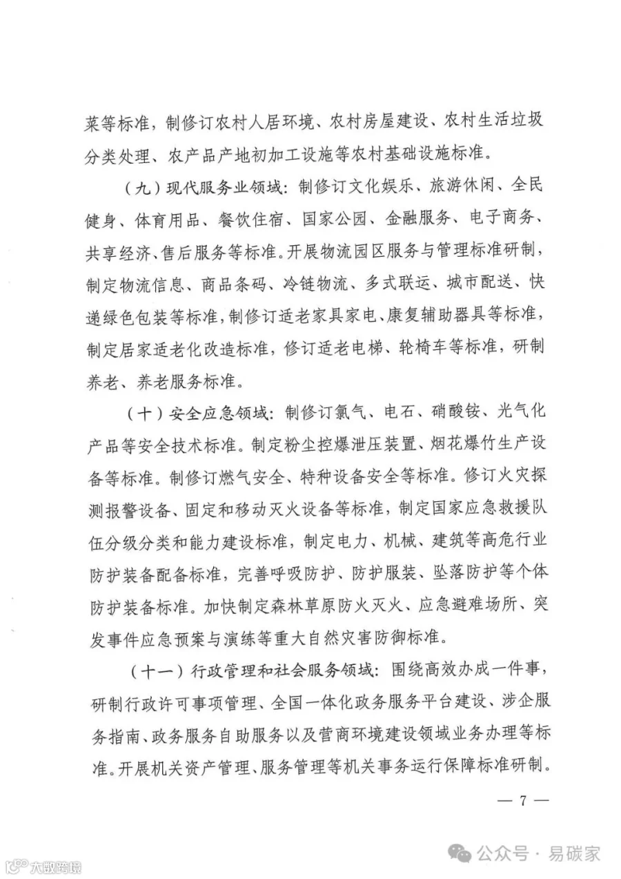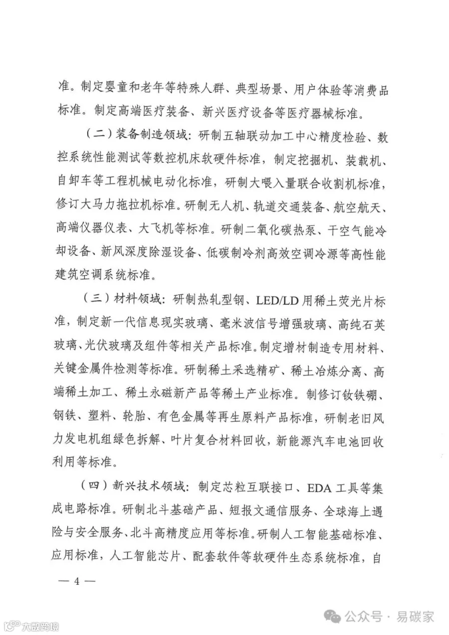 绿色低碳领域:制定新能源汽车充电设备节能标准,研制绿色设计、绿色生产、回收拆解等标准。加强碳捕集、封存和利用标准研制,制定重点行业碳排放核算标准和重点产品碳足迹标准。研制绿色供应链管理、绿色制造、再制造等领域标准,制定电炉炼钢工艺及装备技术改造、短流程炼钢碳足迹核算核查等标准。修订微型计算机、燃气灶具、智能坐便器、洗碗机等产品能效水效标准,制修订家电、家具、卫生陶瓷、纺织品、纸制品等绿色产品评价标准。