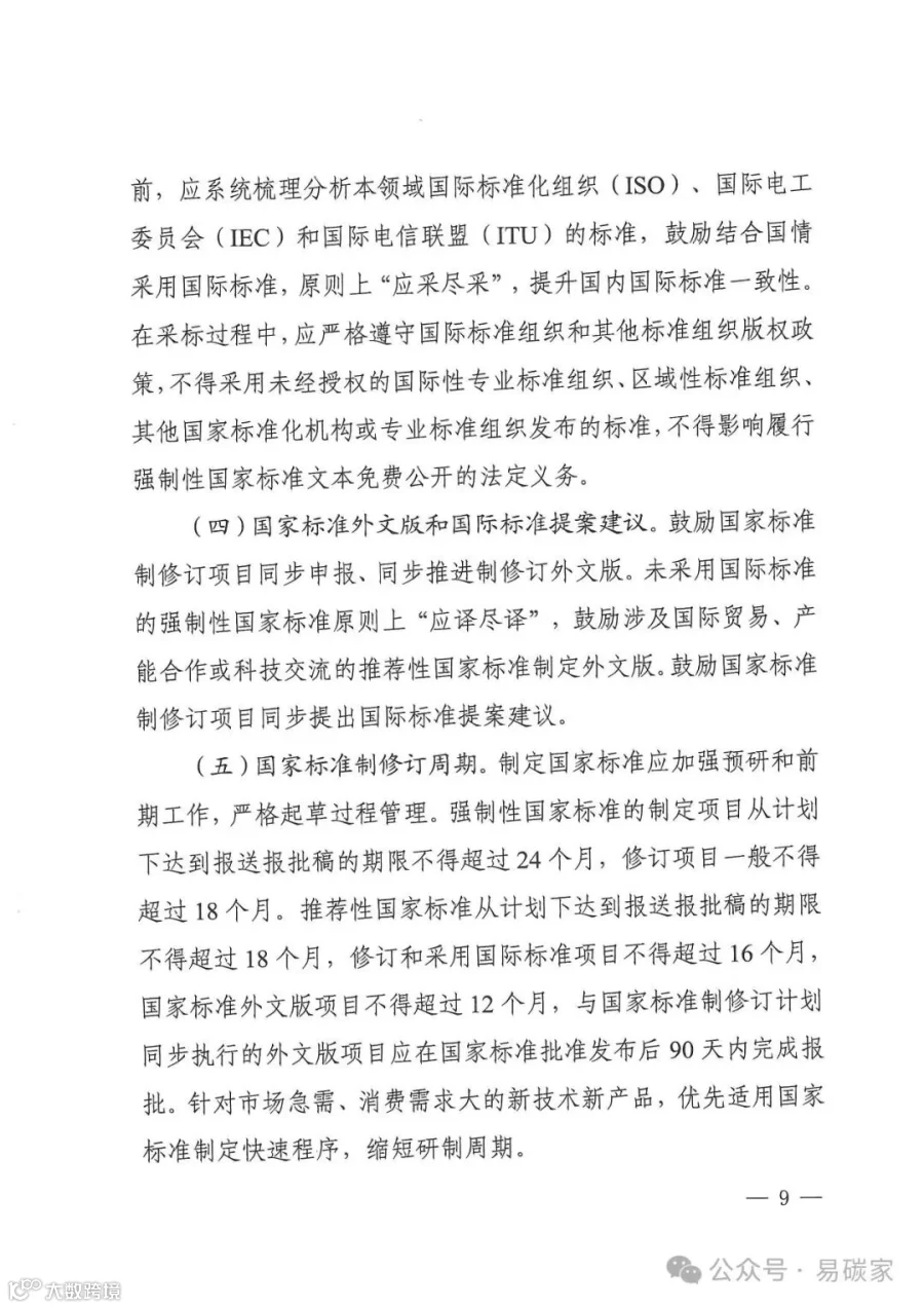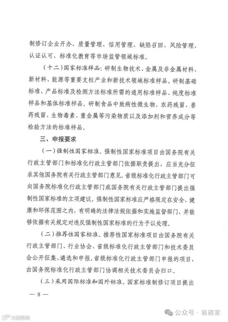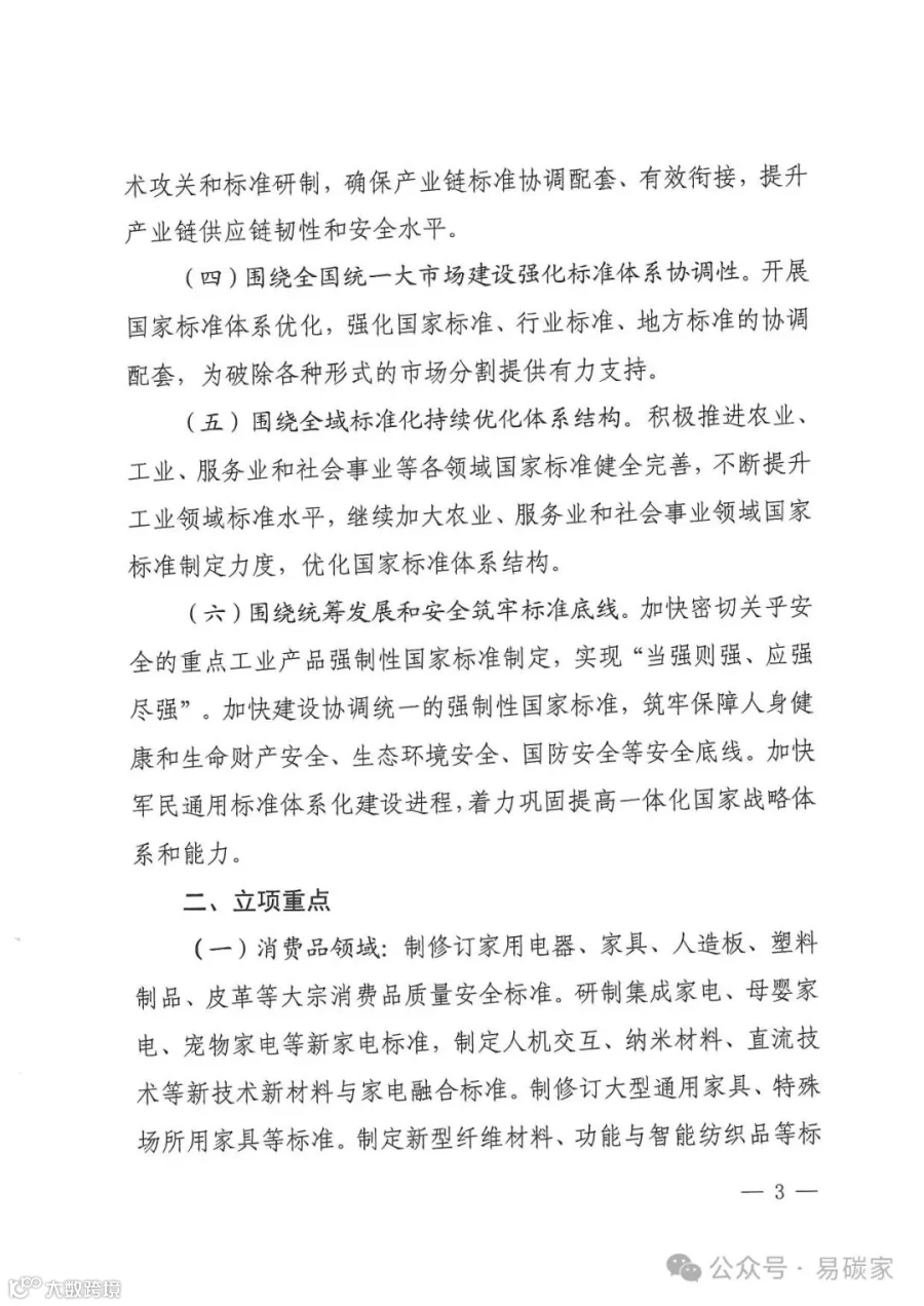 绿色低碳领域:制定新能源汽车充电设备节能标准,研制绿色设计、绿色生产、回收拆解等标准。加强碳捕集、封存和利用标准研制,制定重点行业碳排放核算标准和重点产品碳足迹标准。研制绿色供应链管理、绿色制造、再制造等领域标准,制定电炉炼钢工艺及装备技术改造、短流程炼钢碳足迹核算核查等标准。修订微型计算机、燃气灶具、智能坐便器、洗碗机等产品能效水效标准,制修订家电、家具、卫生陶瓷、纺织品、纸制品等绿色产品评价标准。