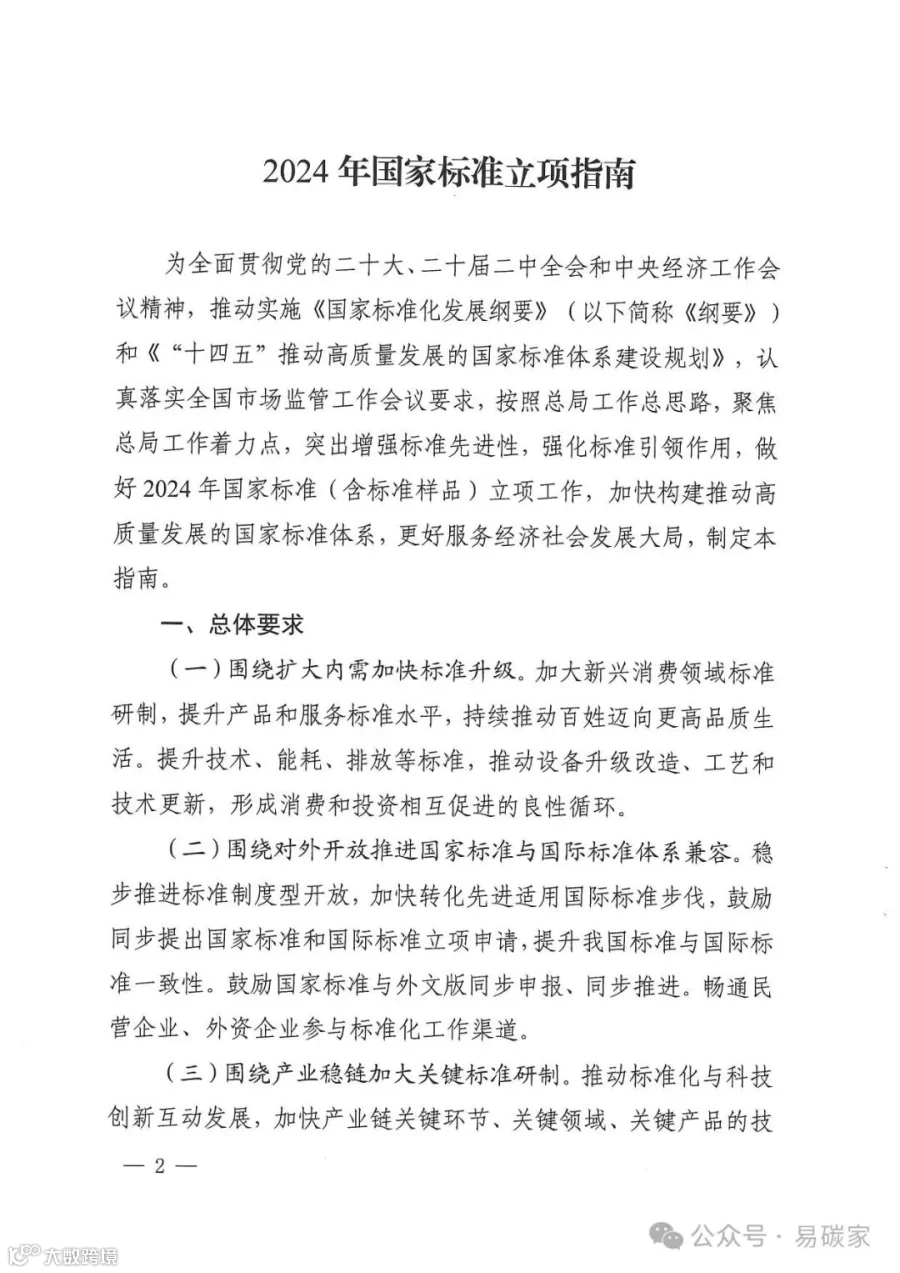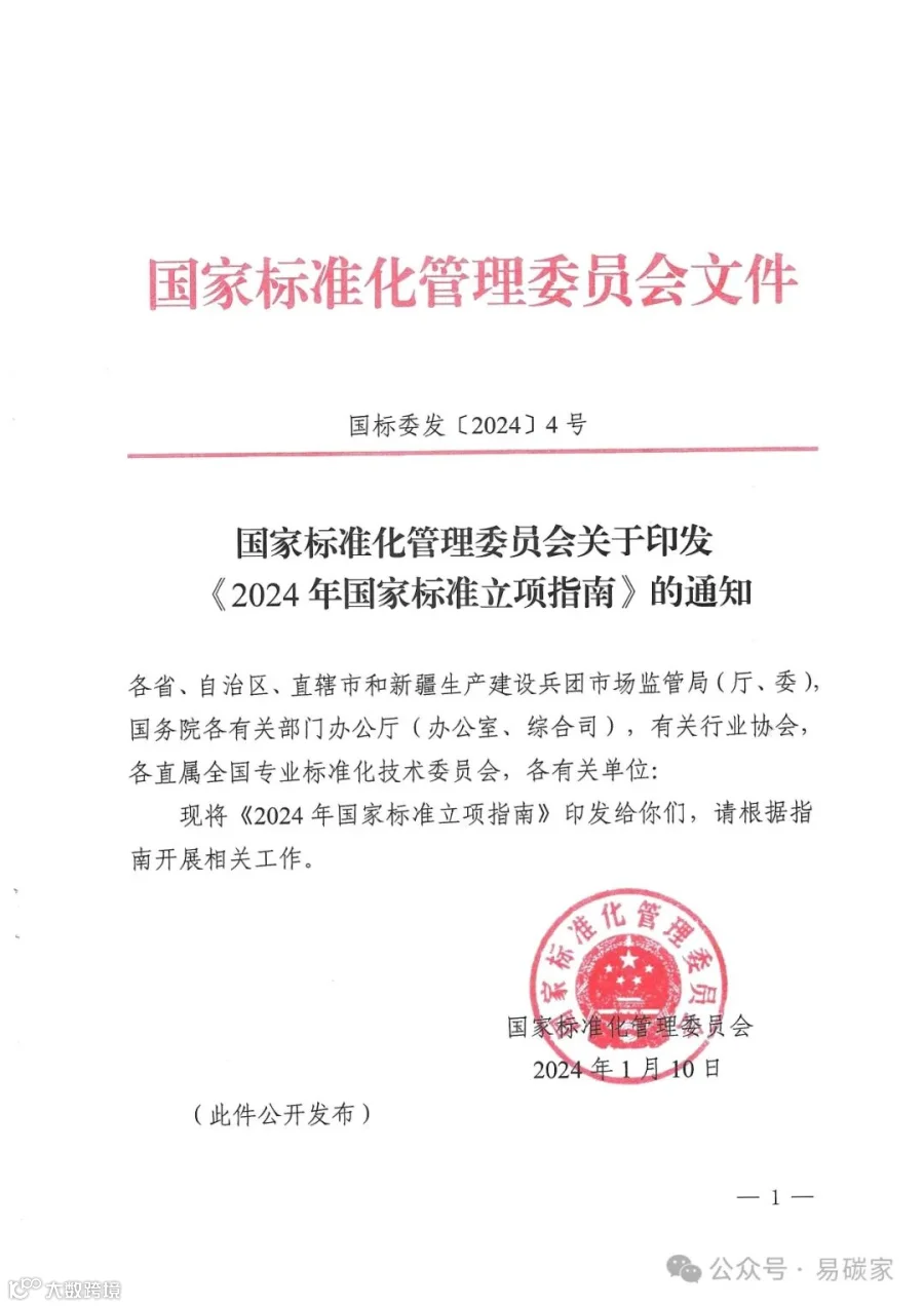 2024年1月12日,国家标准化管理委员会发布关于印发《2024年国家标准立项指南》的通知,重点支持节能减污领域、绿色低碳领域、装备制造领域、新兴技术领域等多个领域标准制定。