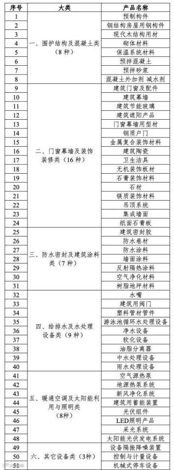 2020年8月3日,市场监管总局、住房和城乡建设部、工业和信息化部联合发布《绿色建材产品分级认证目录》(第一批),共有六大类51种产品可以申请绿色建材产品分级认证(如上图),后续,随着时机的成熟,将有更多种类的建材产品可申请认证,并应用到工程项目中。
