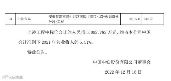 中国中铁中标价合计约人民币589亿元,约占公司2021年营业收入的5.51%。