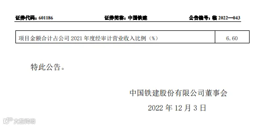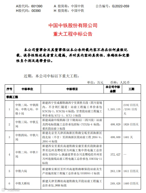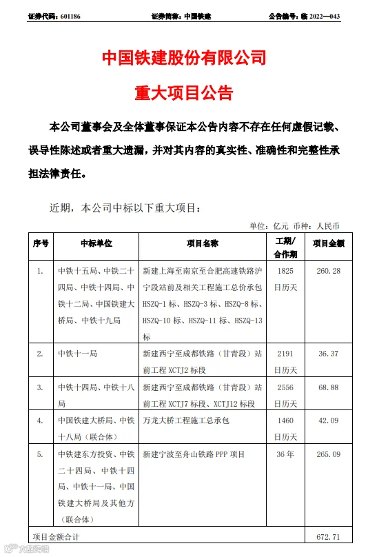 中国铁建发布重大项目公告称,已中标合计672亿重大项目。