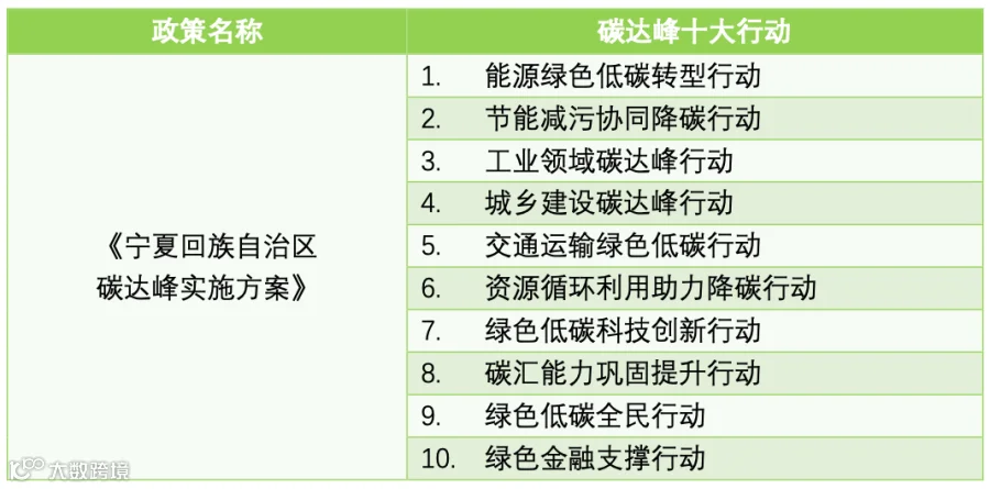 《宁夏回族自治区碳达峰实施方案》聚焦“十四五”、“十五五”和“十六五”三个重 大转型时期,明确碳达峰目标将于“十五五”时期顺利实现,重点实施十大行动,将碳达峰 贯穿于经济社会发展全过程和各方面。