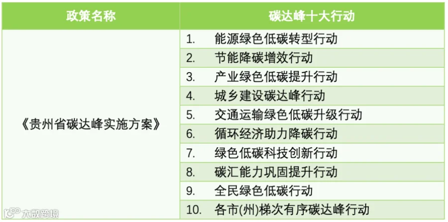 《贵州省碳达峰实施方案》为推动全省域全方位稳妥有序做好碳达峰工作,制定了“十 四五”和“十五五”两大时期的目标,同时制定了“碳达峰十大行动”,多处明确支持贵州 绿色发展。
