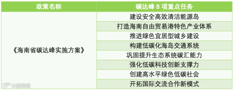 《海南省碳达峰实施方案》提出在能源结构清洁低碳化、产业结构优质现代化、交通运 输结构去油化、城乡建筑低能耗化,海洋和森林碳汇贡献、低碳技术推广应用、低碳政策体 系制度集成创新等方面,加快形成一批标志性成果,走在全国前列,争做碳达峰碳中和工作 “优等生”,在国际应对气候变化交流中展示出海南靓丽名片。