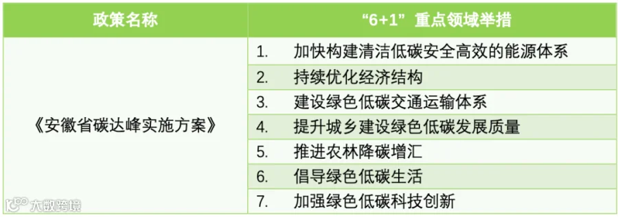《安徽省碳达峰实施方案》立足省内实际,明确省内碳达峰碳中和目标任务,提出符合 实际、切实可行的碳达峰时间表、路线图、施工图,并聚焦能源、工业、交通运输、城乡建 设、农业农村、居民生活和科技创新等“6+1”重点领域,提出推进碳达峰碳中和的路径举措。