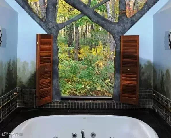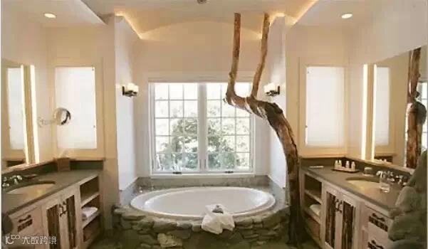 在这间浴室里,下沉式按摩浴缸安装在地台上,阳光通过窗口照进来,窗框设计成树枝的形状——用起来更为舒适,感觉就像是在露营地沐浴。