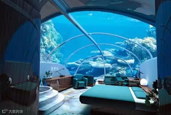 酒店有四套可以看见海底世界的豪华套房,一整面墙都是水族箱式的玻璃,无论是躺在床上还是坐在餐桌边,旖旎的海底风光都一览无遗。