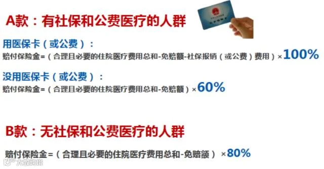 B款:赔付保险金=(合理且必要的住院医疗费用总和-免赔额) ×80%