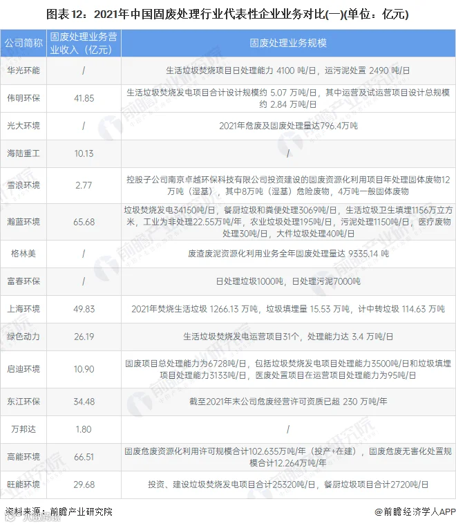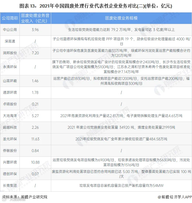 具体来看,我国固废处理行业业务规模较大的企业有光大环境、瀚蓝环境等,2021年,光大环境危废及固废处理量达796.4万吨,瀚蓝环境固废处理业务营业收入达65.68亿元,竞争力较强。