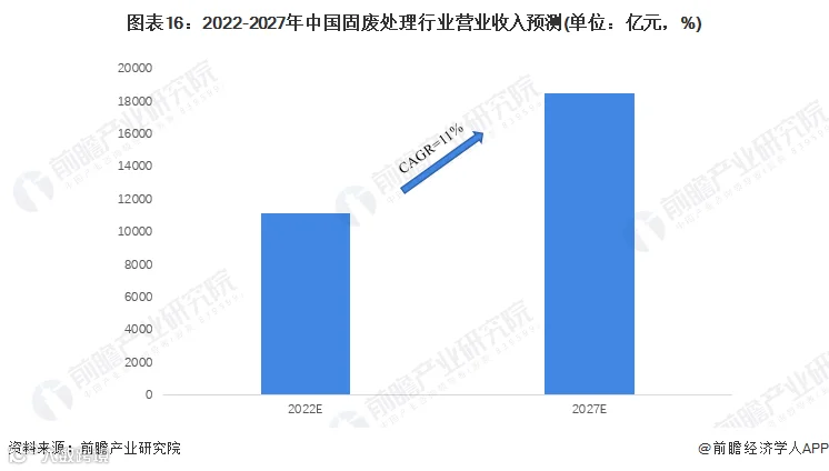 固废处置与资源化利用行业营业收入也将同步扩大,预计2027年有望超过18000亿元,2022-2027年年复合增长率约为11%。