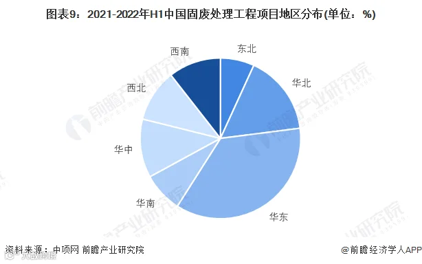 根据中项网数据,2021-2022上半年,我国固废处理工程招投标项目分布最为集中的区域为华东地区,固废处理工程项目数量共计58个,占全国总数量的36.02%,其次为华北地区和华中地区,分别占比16.15%和11.80%。