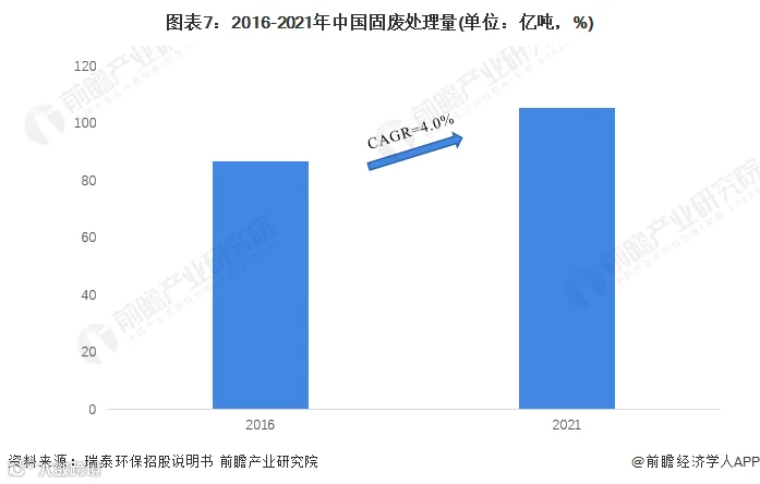 全球低碳的大环境下,我国环保产业整体发展良好,固废处理能力不断提高。瑞泰环保招股说明书数据显示,2016-2021年,中国固废处理量由86.86亿吨上升至105.52亿吨,年复合增长率约为4.0%。