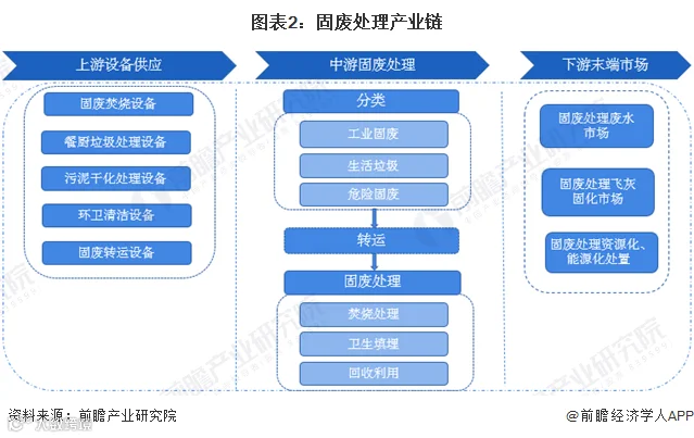 固废处理行业上游主要是固废处理设备制造,包括焚烧设备、餐厨垃圾处理设备、污泥干化处理设备、环卫清洁设备、固废转运设备等;中游固废处理环节可分为固废分类、固废转运和固废处理;下游则主要是废弃物资源回收循环利用等。