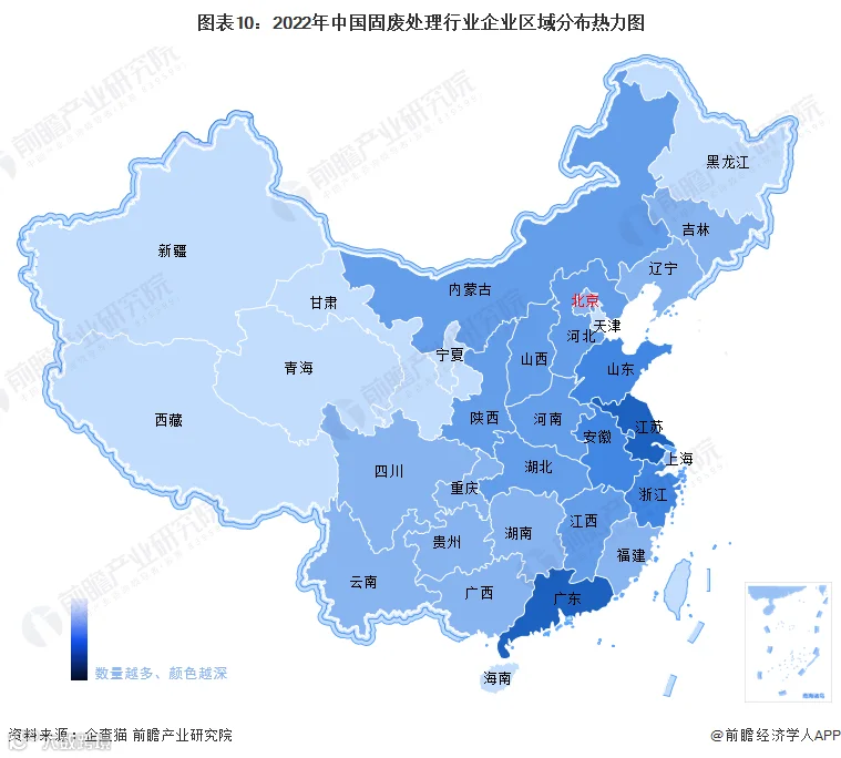 从企业区域分布来看,我国固废处理行业企业同样集中在华东地区。根据企查猫数据,截至2022年9月,江苏省固废处理相关企业数量超过1000家,位列全国第一,广东、安徽、山东和浙江省企业数量也均超过500家。