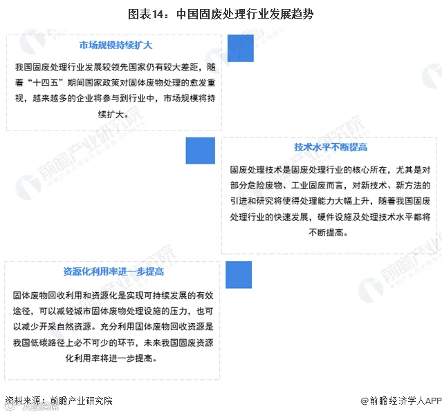 我国固废处理行业发展趋势主要有市场规模持续扩大、技术水平不断提高、资源化利用率进一步提高三个方面。