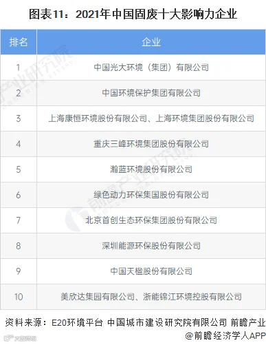 根据E20环境平台和中国城市建设研究院有限公司共同发布的“中国固废十大影响力企业”,2021年我国固废处理领域领先企业有中国光大环境(集团)有限公司、中国环境保护集团有限公司、