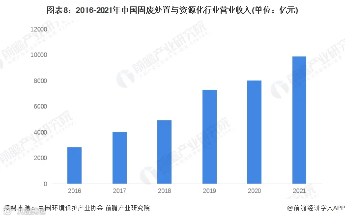》,2016-2020年,我国固废处置与资源化行业营业收入逐年提高,2020年达8030亿元,初步估算2021年约为9900亿元。