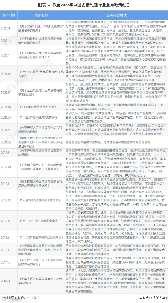 我国固废处理行业较发达国家起步较晚,从政策历程来看,2005年,《中华人民共和国固体废物环境污染防治法》正式实施,“十一五”期间国家政策主要鼓励对固体废物实行回收和利用、减少固体废物生产量;“十二五”时期,《关于建立完整的先进的废旧商品回收体系的意见》出台,我国开始加强对固体废物进口的监管,同时深入推进大宗固体废物综合利用,加强共性关键技术研发及推广,固废处理行业受重视程度增加;“十三五”时期,《“无废城市”建设试点工作方案》、《工业固体废物资源综合利用评价管理暂行办法》等政策出台,提出要全面整治历史遗留尾矿库,统筹推进大宗固体废弃物综合利用,鼓励专业化第三方机构从事固体废物资源化利用相关工作,固废处理行业发展进一步加快;“十四五”以来,低碳化进程推进的带动下,固废处理相关国家政策进一步优化,支持力度进一步加大,全面禁止进口固体废物,继续加强大宗固废综合利用,大力开展“无废城市”建设,固废处理行业发展进入快车道。