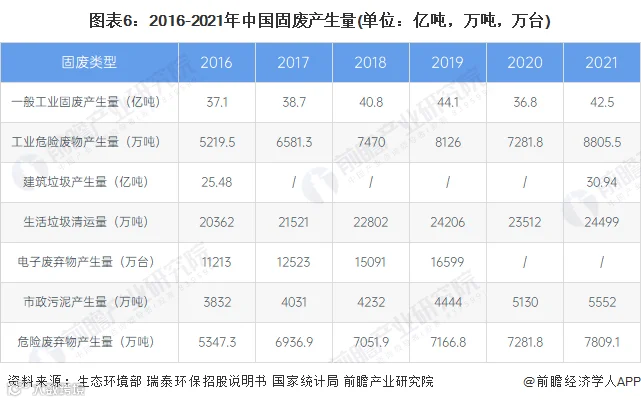 近年来我国国民经济快速发展、城镇化水平持续提高,固体废物产量也快速增加。2016-2021年我国部分固体废物产生情况如下: