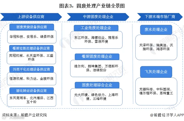 固废处理行业上游代表企业有固废焚烧设备供应商华冠科技、安居乐、绿景环保,餐厨垃圾处理设备供应商邦冠机械、水天蓝环保、三盛环保,污泥干化处理设备供应商恒源机械、科力达、金陵环保,固化转运设备供应商东风商用车、北汽福田、江西五十铃等;中游参与者按处理固废类型可分为工业危废处理企业、餐厨固废处理企业、固废处理综合企业等;下游主要参与者包括废水处理企业天泽环保、瑞美迪、沃腾环保、鸿淳环保,飞灰处理企业