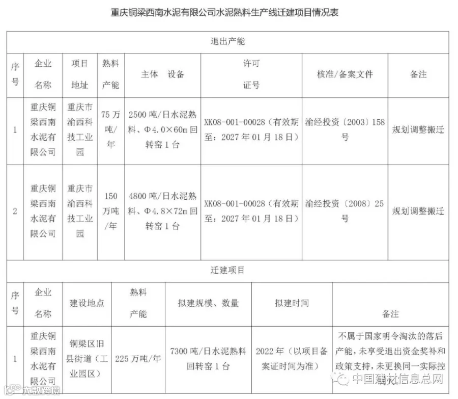 1月18日,重庆市经信委发布关于重庆铜梁西南水泥有限公司水泥熟料生产线迁建项目情况的公示。