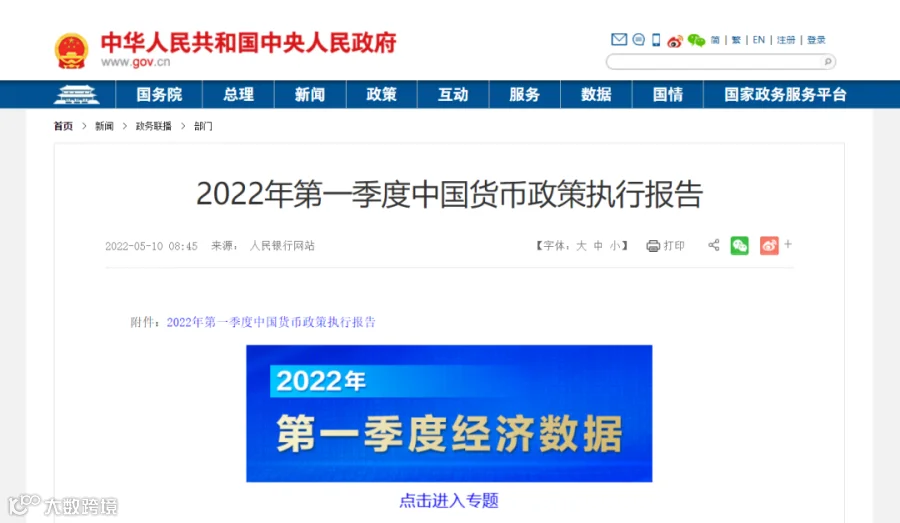 央行近日发布2022年第一季度货币政策执行报告。