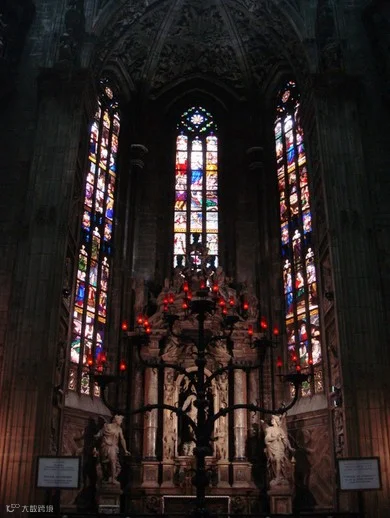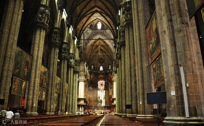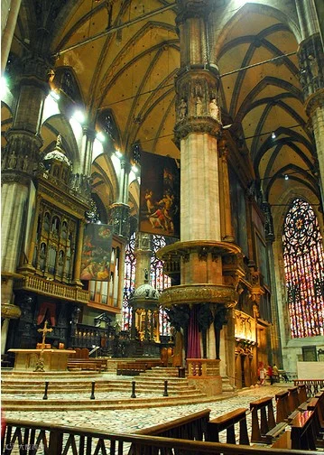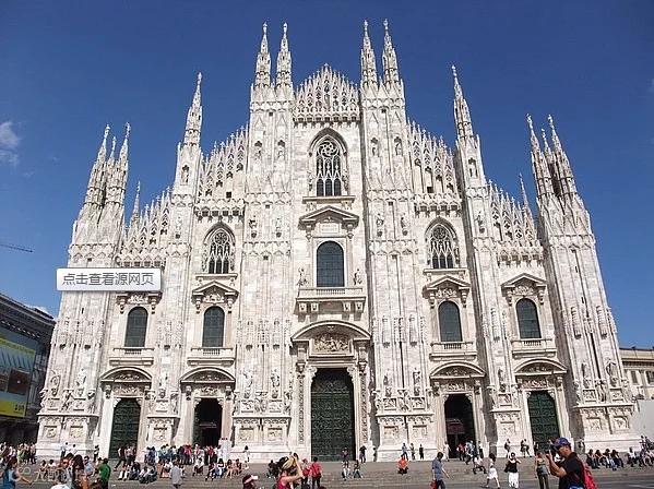 意大利米兰大教堂是欧洲中世纪最大的教堂,可供4万人举行宗教活动。它始建于公元1386年,到公元1485年才完成。这座教堂全由白色大理石筑成,大厅宽达59米,长130米,中间拱顶最高45米。教堂的特点在它的外形。尖拱、壁柱、花窗棂,有135个尖塔,像浓密的塔林刺向天空,并且在每个塔尖上有神的雕像。教堂的外部总共有2000多个雕像,甚为奇特。如果连内部雕像总共有6000多个雕像,是世界上雕像最多的哥特式教堂。因此教堂建筑格外显得华丽热闹,具有世俗气氛。这个教堂有一个高达107米的尖塔,出于公元15世纪意大利建筑巨匠伯鲁诺列斯基之手。塔顶上有圣母玛利亚雕像,金色,在阳光下显得光辉夺目,神奇而又壮丽。
